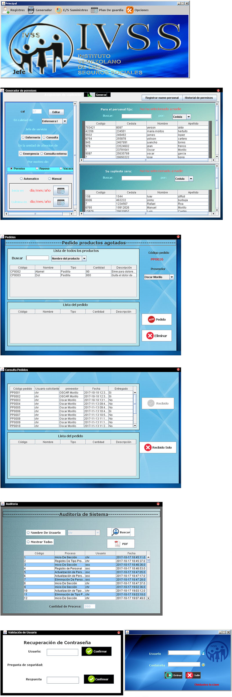 Esta es una aplicación creada para el área administrativa del ambulatorio del Seguro Social del Limón (IVSS), esta aplicación es un sistema completo debido a que cuenta con varias funciones en 3 áreas distintas y que se mantienen sincronizadas entre sí. Sus 3 principales funciones son: Generador de Reposos automático, Generador de plan de guardia y un control de inventario que atiende tanto la requisición interna como la externa.